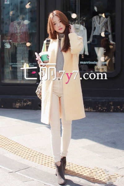 浅黄色毛呢大衣外套,柔和甜美,简单的版型,线条流畅,上身效果非常显瘦。立领设计更加利落有型,这款大衣完美衬托出MM恬静温柔的一面。内搭灰色短款毛衣和白色紧身裤,微微露脐很是性感优雅。