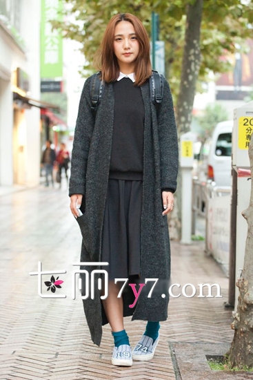 日本女孩涩谷系街拍图片,本季流行的骑士装的特点已然不是宽松廓形,而是苗条的紧身线条。不经过袖子直接轻松穿在肩上的款式,彰显成熟韵味。