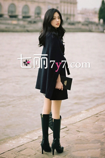 这款斗篷大衣非常显瘦,前面是复古的双排扣设计,而且还配上了腰带,不同于一般的斗篷式大衣,在后面配上了一条披肩,既显气质又有气场。配黑色高跟长筒靴,优雅显高挑。