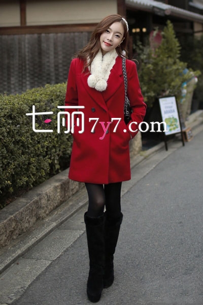 红色大衣色彩偏暗,刚好将MM的肌肤衬托得很白皙,版型简约修身很是显瘦,经典款式,穿出知性干练的气质,配黑色丝袜和黑色长筒靴,性感迷人。一条白色皮草围脖凹造型,增添奢华名媛范儿。