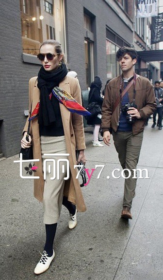 时尚点评:黑色的上衣是显瘦必选衣服,下身搭配长款直筒的裙子,拉长内搭的身材线条,外套一件驼色的大衣,别提多么拉风了。后面跟着的摄影师,整体简直棒到没话说。
