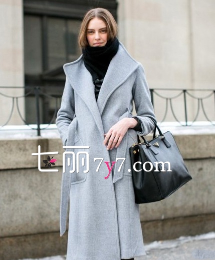 时尚点评:灰色的大衣,剪裁呈伞开的趋势,从上往下的比例现象出独特的韵味,大翻领搭配黑色的围巾,让整体变得相当有气质,而且整个人都提升了一个档次,走在街头一定会成为一道靓丽的风景。