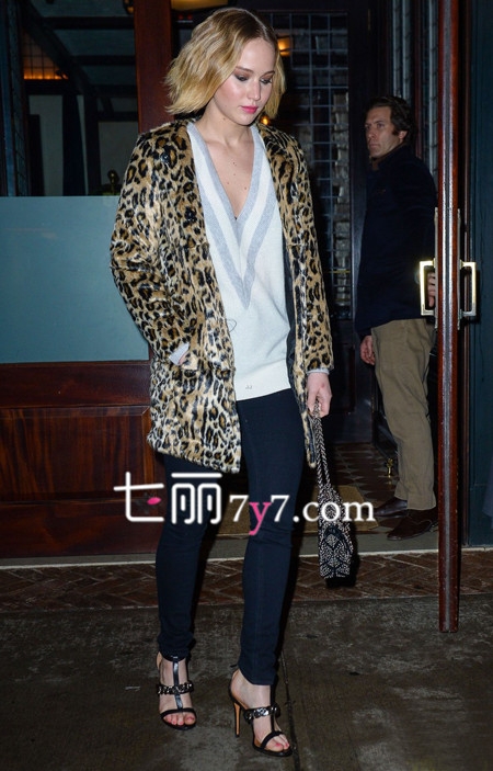 12月16日,詹妮弗·劳伦斯(Jennifer Lawrence)纽约街拍,身穿深V领毛衣打底衫,外披野性豹纹外套,下半身搭配一条紧身裤,脚踩优雅凉鞋,精致妆容上阵,女人味十足!