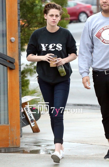 12月16日,克里斯汀·斯图尔特(Kristen Stewart)加州Los Feliz小镇街拍,身穿字母印花卫衣T恤,搭配牛仔裤,卷起裤腿彰显个性与时尚。脚踩白色平底鞋,休闲舒适。
