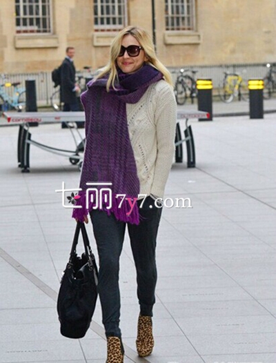 七丽时尚点评:菲妮-科顿用白色钩花毛衣,搭配紫色围巾,轻松营造出暖色调的层次搭配,只有优雅时髦,而脚上踩着一双豹纹的及裸靴,即可打造出欧美女星酷爱的简约范儿。