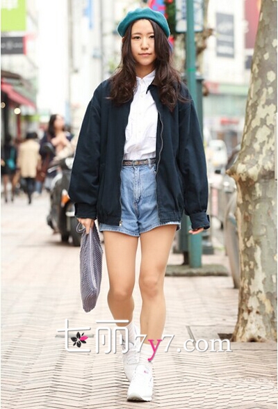 Oversize飞行员夹克露出一截短裤这样的时尚指数拿捏的刚刚好,利用短袜带来健康feel,白衬衫搭配牛仔裤的刺绣细节部分,给美式风格的穿搭融入了一点小精致,起到是街头风与时尚单品的碰撞。