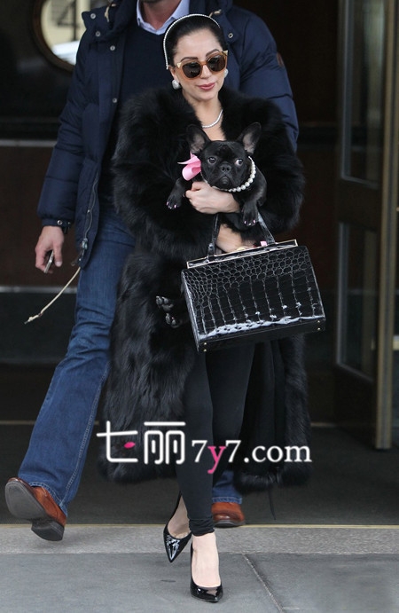 12月22日,Lady Gaga手抱萌宠一起出街,身穿黑色皮草大衣搭配黑色打底裤,手提光感十足的包包,脚上一双尖头高跟鞋,变身优雅贵妇。