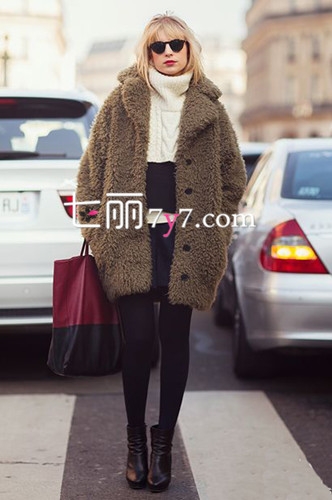 黑白两色拼接短款高领毛衣,配上下半身黑色短裤和纯黑打底裤。套上一个宽松毛绒绒的大外套,温暖指数直线上身。搭配一双高跟踝靴有效拉长腿部线条。这套整体搭配的确是冬季不错的选择。