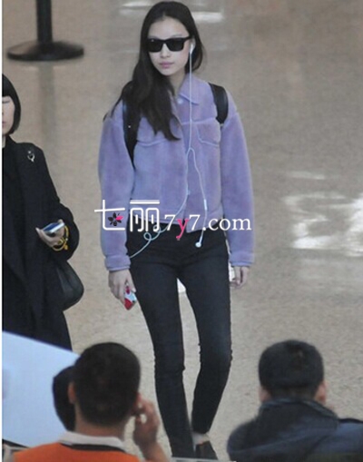 小花旦倪妮浅紫色羊羔毛外套+黑色修身高腰长裤+帆布鞋,让其看起来十分的清新甜美,浅紫色毛绒短外套搭配黑色紧身裤和厚底鞋,搭配一个双肩包,衬托出减龄又清新的气质。