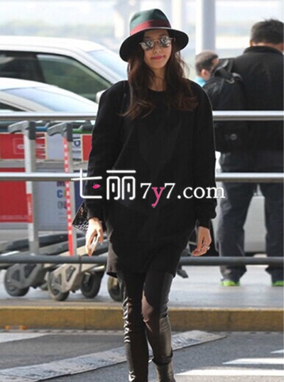黑色花朵印花宽松套头毛衣连衣裙+黑色皮裤+黑色短靴+黑色单肩包+太阳镜+帽子,唐嫣整体全黑的搭配,看起来十分的酷,而且整个造型搭配上还极富有层次感,为了摆脱黑色的沉闷,用一顶绿红小撞色的小礼帽来点缀,则完美凸显出不俗的时尚气质。