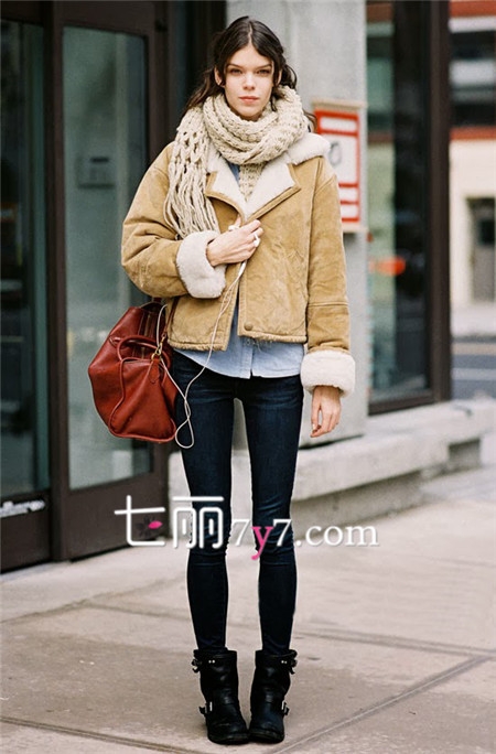 皮毛一体厚外套非常的保暖,搭配米色流苏围巾和紧身牛仔裤,脚上一双休闲短靴,红棕色包包装饰,整体色调柔和,温暖舒适!