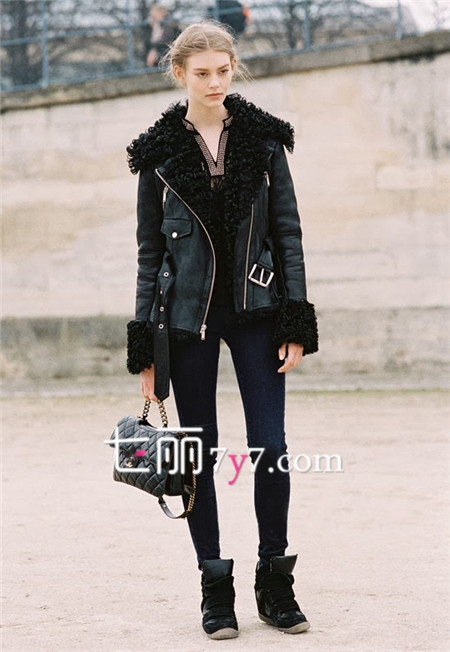 黑色皮夹克,粗毛内里,翻领设计,时尚保暖。搭配紧身牛仔裤,手提香奈儿包包,脚上一双内增高球鞋,经典黑色一套,打造酷酷的感觉。