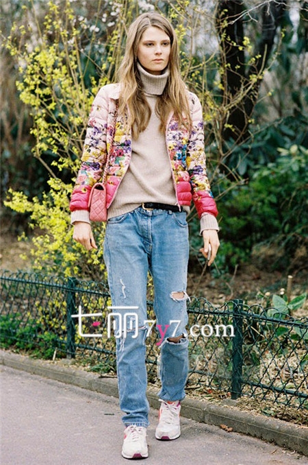 甜美粉色印花小棉袄衬托出小女人味,内搭淡橄榄色复古高领毛衣,下面一条男友牛仔裤,白色运动鞋,柔美中又见洒脱和随性。