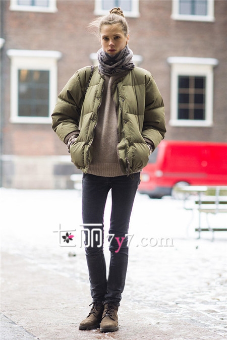 轻盈厚实的橄榄绿色羽绒服,内搭灰色毛衣,围巾将脖子紧紧围住,下面一条牛仔裤,脚踩休闲短靴,保暖舒适出门,而不失型格。