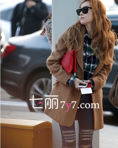 驼色呢子大衣,是最经典不败的色系,而且这样的衣服款式几乎是每个女生衣橱都有一件的单品,郑秀妍混搭格子衬衫+破洞牛仔裤,用红色信封包包做点缀,简直是太出彩了。