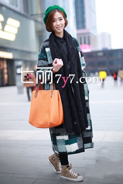 这位美女身着格子毛呢大衣,及踝的长度不仅保暖性强吗,还带来强大气场,廓形设计干练有型,不规则的格子图案个性特别,搭配绿色帽子和橙色包包,撞色搭得很巧妙。豹纹高帮布鞋,十分抢眼。