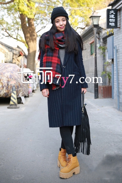 国内长腿美女冬季街拍 格子大衣诠释韩系小清新