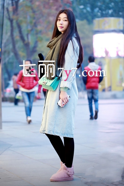 浅色外套长款设计,让高挑MM更有气质,水洗牛仔材质,显得很是怀旧,而且还带着小清新文艺范儿,搭配上黑色裤袜和粉色雪地靴,休闲随性。军绿色围脖和薄荷绿包包,十分抢眼。一头飘逸的长发,十足的文艺女神。