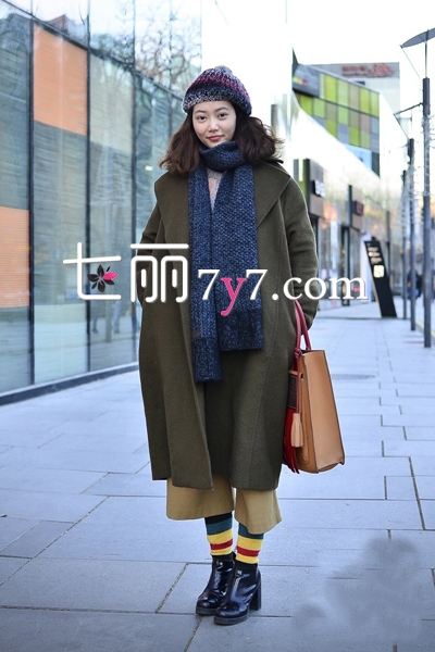 这身造型型层次感十足。军绿色呢子大衣,廓形设计时髦有范,穿出不一般的气场。搭配阔腿裤和条纹袜,让造型更有个性。藏蓝色围巾和毛线帽子,使MM看上去俏皮可爱。