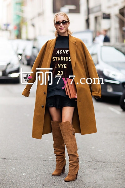 驼色长款大衣,穿出优雅气质,廓形设计更显大气有型,款式经典而不失时尚,内搭黑色衣裙,再配上同色系的过膝长筒靴,尽显穿搭品味。棕色手包为整体造型更添气场。