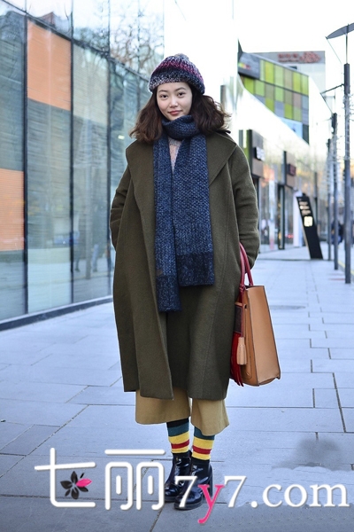 军绿色大衣廓形设计,长款样式,时髦有范,穿出不一般的气场彩色条纹袜和鞋子的搭配很有个性,再搭配藏蓝色围巾更添女生浅浅的文艺范。