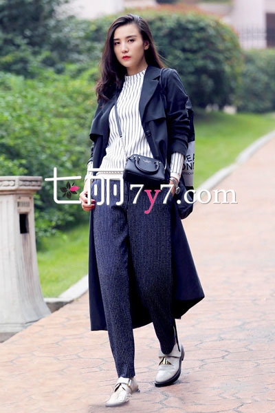 黑白灰是冬季最常用的色调,它的经典无法取代。小花老师身着黑色长款风衣搭配条纹上衣和休闲裤,强大的气场早已按耐不住,看似毫无亮点的单品,却被搭配的很具潮范儿。