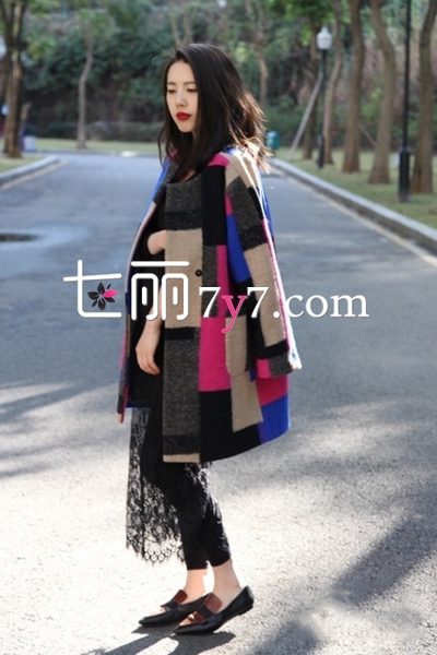拼色毛呢大衣外套,多种色彩的相撞,给人呈现出时尚现代感,看似杂乱无章的色彩拼接,却并没有很凌乱的感觉,非常时髦有个性。搭配上黑色衣裤,配上毛文尖头鞋,想不要气场都难。
