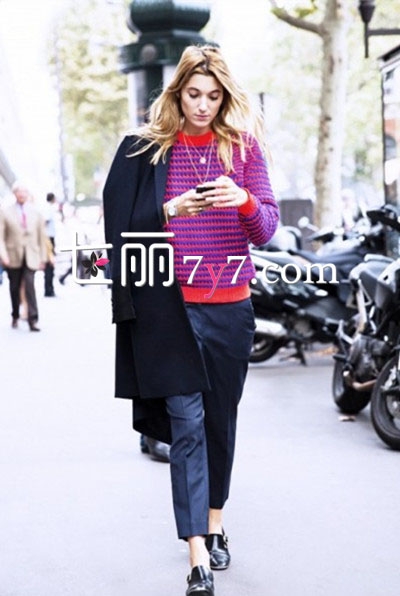 何穗最新街拍,灰色毛衣+墨绿色光泽感半裙,文艺慵懒,少女感十足。马海毛毛衣来自H&M,手提包和粉色毛拖鞋均来自Gucci,半裙来自Tibi 2016