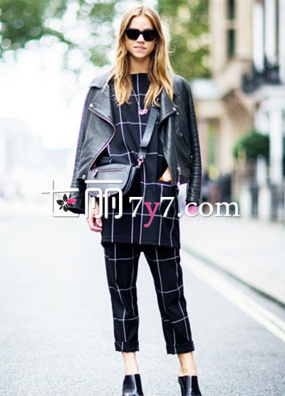 搭配看点:格纹是永不会退出时尚舞台的潮流元素,相对于小方格,大方格今年更为流行也更大气。整套look都是深色系,至in亮皮短靴和墨镜酷劲十足,披着的机车皮衣外套更为造型加分不少。
