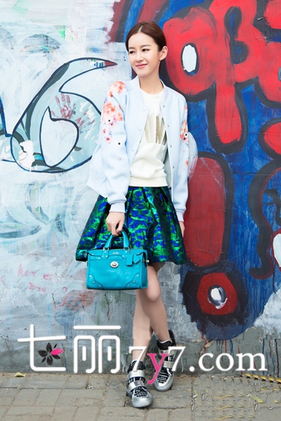 身穿浅蓝色休闲印花外套,内搭一件纯白色卫衣,简单却又非常时尚,外套上的印花十分抢眼,在冬日用这样一件缤纷浪漫的外套打破沉闷最好不过,而下半身搭配的是一条绿色印花短裙,十分的抢镜,同时彰显出她时尚靓丽的气质 。