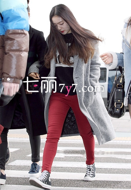 浅灰色呢子大衣外套,简约的一粒扣设计配上精简的款式,凸显强大御姐气场。内搭黑色印花毛衣,下穿红色紧身裤和高帮布鞋,混搭运动风,充满少女气息的青春活力感。