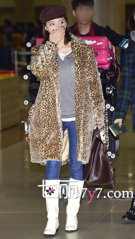 孝敏狂野的豹纹外套,毛绒绒的质感看起来十分的舒适温暖,内搭一件灰白色拼接的T恤衫,下搭一条紧身牛仔裤和白色高筒靴,立即凸显出欧美大牌范,再一顶酒红色的贝雷帽,显得更加时髦迷人。