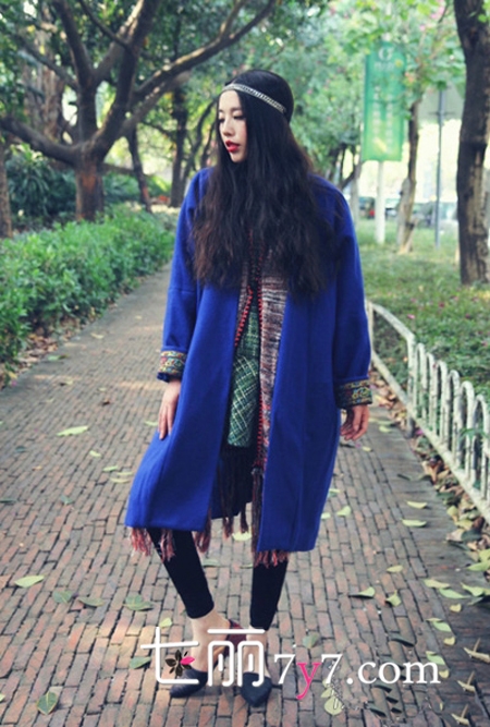 蓝色呢子大衣,颜色吸晴养眼,也是今年冬季很流行的色调,内搭格子毛呢连衣裙,系上民族风流苏长围巾,带点复古小清新的味道,同时还透着浓郁森女风的气息。