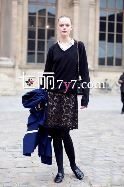 藏蓝色v领毛衣内搭白衬衫,下穿黑色蕾丝短裙,搭配裤袜和英伦风皮鞋,很简单时髦的装扮,给人一种很轻松舒服的feel。宝蓝色呢子大衣和链条包包,就能点亮冬季造型。