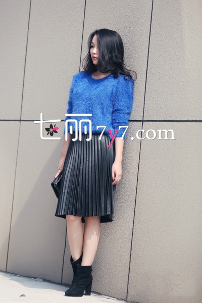 何穗最新街拍,灰色毛衣+墨绿色光泽感半裙,文艺慵懒,少女感十足。马海毛毛衣来自H&M,手提包和粉色毛拖鞋均来自Gucci,半裙来自Tibi 2016