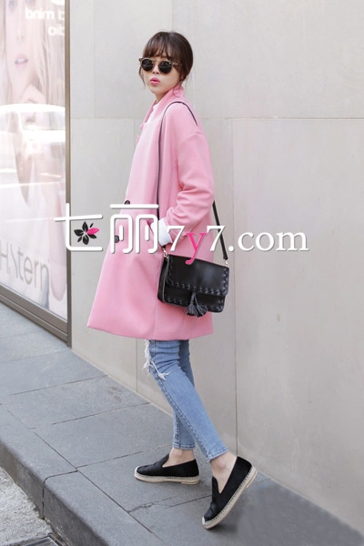 粉色大衣让MM显得更加娇俏妩媚,充满小女人气息。时髦的廓形设计,简约的小立领设计,混搭上破洞牛仔裤和黑色懒人鞋,时髦韩范儿,背上百搭的黑色小挎包,美美地去约会吧。