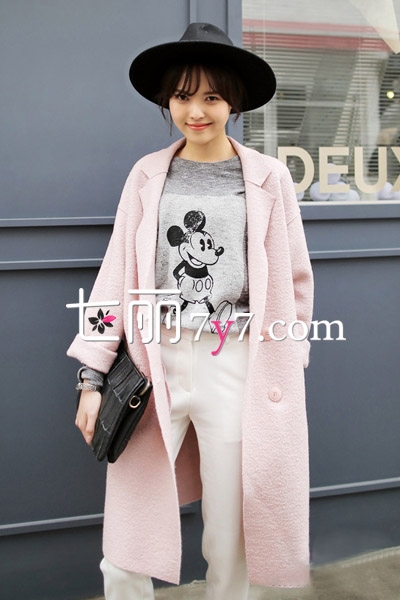淡淡的粉色呢子大衣,宽松的茧型设计,随意且时尚,简单的袖子挽起来穿,显得不那么古板,搭配灰色卡通卫衣和白色高腰休闲裤,清新甜美又不失可爱。戴上一顶黑色宽檐帽,更加有魅力。