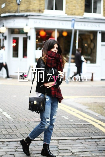 搭配看点:boyfriend style牛仔裤搭配机车皮衣,看上去有种桀骜不驯的帅气风格,让你轻松成为众人焦点。若想增添几分女人味,也可以在此搭配基础上佩戴一些鲜艳的饰品,例如红格子围巾。