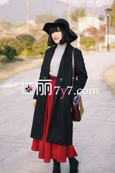 黑色长款你在外套,两粒扣设计和简约的款式彰显出安静的复古气息,内搭灰色高领毛衣和大红色毛呢半身长裙,轻松打造文艺女神气质。踩上高跟鞋,戴上宽檐帽,更显时尚优雅范儿。