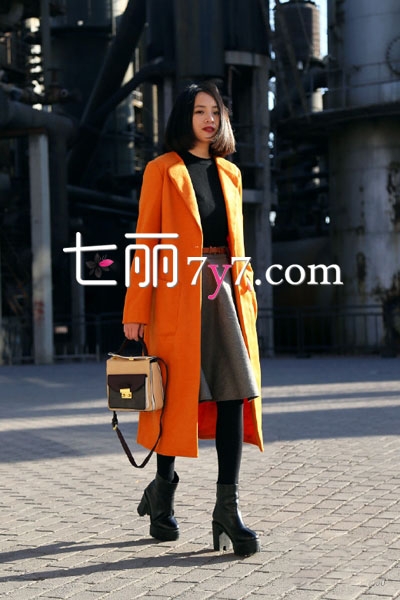 长款橘色呢子大衣外套,极具气场的一件单品,时髦的廓形款式,干练大气。搭配黑色毛衣和灰色伞裙,也是最能表达时髦韵味的服饰,再配上黑色裤袜与粗跟短靴,穿出高雅姿态。