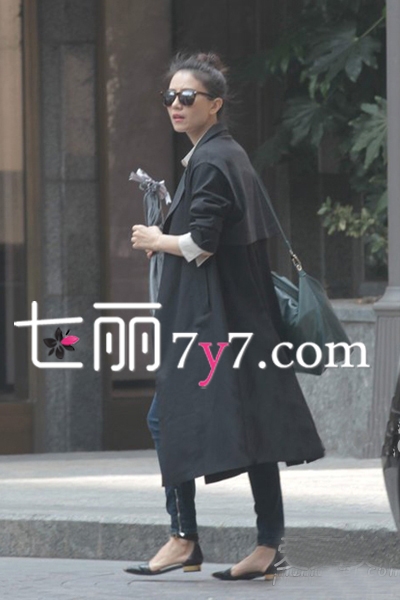 黑色长款风衣外套,拥有宽松的裁剪,超长款设计,是今年当季超流行的侦探风格,搭配小脚牛仔裤和平底鞋,轻松穿出优雅味道,扎着丸子头,减龄扮嫩,同时洋溢着青春气息。
