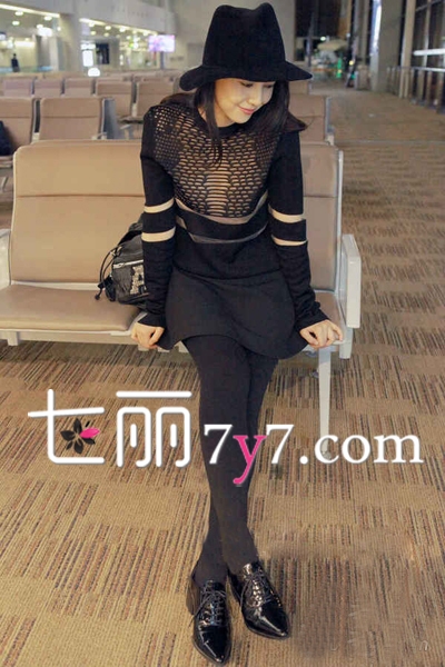 透视设计的黑色长袖上衣搭配同色系打底裤裙,穿出了性感轻熟女的气质,服饰的简约风格,在女神的演绎下变得迷人养眼,搭配一双英伦风亮面皮鞋以及帅气的帽子,让女神变得更具熟女魅力。
