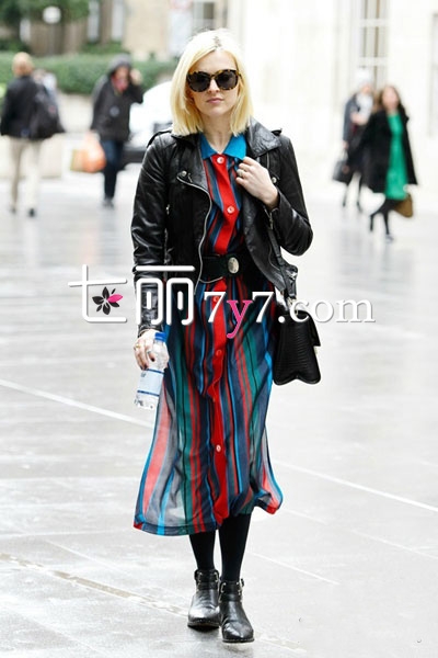 黑色机车皮衣外套,经典的款式有型帅气。搭配彩色条纹连衣长裙,这样的穿法比较经典,用鲜亮的颜色诠释经典的竖条纹,展现欧美达人的好品味,再穿上黑裤袜和及踝短靴,酷劲十足。