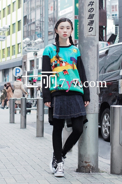 拼色套头印花毛衣,采用黑色与青色的搭配,尽显清新时髦感,可爱的卡通印花犹如一幅画,充满童趣与活力。下穿牛仔短裙和黑色裤袜,踩上黑色高帮帆布鞋,这样简单的层次感穿法,非常可爱有型格。