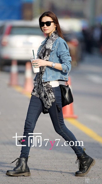 搭配看点:黑色马丁靴,酷劲十足,不管是将裤脚塞进鞋内还是卷起都别有风味。黑色挎包,低调雅致,印花围巾加强层次感,更让造型时尚指数瞬间飙升。除了牛仔上衣和裤装,其余全是黑白无彩色,这就是街拍达人搭配秘籍。白T的加入给整个造型带来一丝清新感,更完美的塑造了上下身比例。