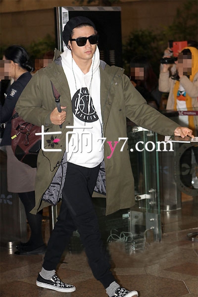 玉泽演此次现身机场很显憔悴,“大叔”范儿十足。军绿色工装大衣,内搭白色连帽卫衣,下穿黑色休闲裤和印花懒人休闲鞋,穿上灰色短袜混搭潮范儿。戴上墨镜帽子,挎上酒红色双肩包,尽显街头范儿。