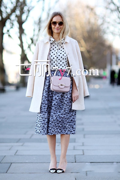 白底黑色波点衬衫,搭配蓝色印花半身伞裙,优雅中不乏复古气质。肩披一件米色薄款大衣外套,看上去清新又淑女,拼色尖头高跟鞋也搭配得十分别致。整个造型极具早春气息。