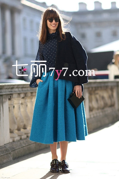 藏蓝色波点衬衫,很优雅浪漫,搭配亮眼的蓝色毛呢半身伞裙最合适不过了,既出彩又不会出错,黑色短款外套更显俏皮,配上黑色手拿包很有气质哦。想要更有气质和女人味?那就把铆钉平底鞋换成高跟鞋把。