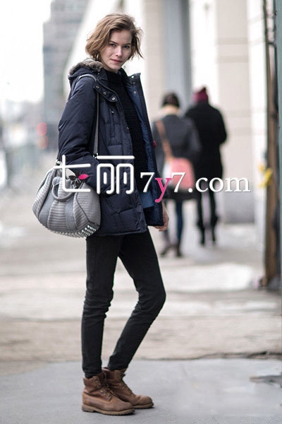 藏蓝色短款棉服外套,内搭黑色上衣,下穿黑色紧身裤和棕色短靴,酷感十足,还带有些许怀旧气息。就是这么经典常见的单品,穿出了不一样的时髦感。背上灰色单肩包,铆钉设计更加突出了造型的主要风格。