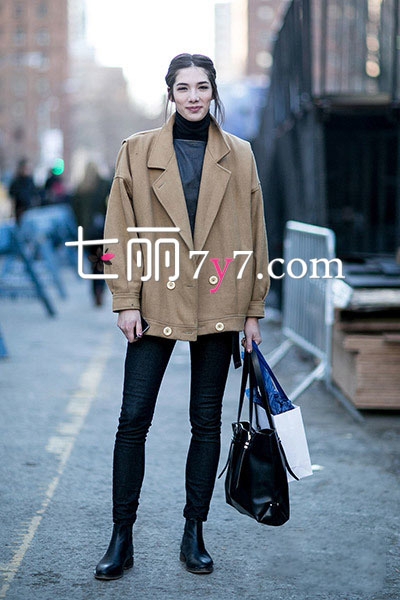 卡其色宽松外套,茧型版型和落肩设计,都很显时髦,四粒扣也让款式变得更加丰富亮眼。内搭深色高领毛衣,下穿黑色紧身裤和及踝短靴,上宽下窄的搭配,很显瘦显高挑。配上一个黑色简约的包包出街,就很有范儿了。